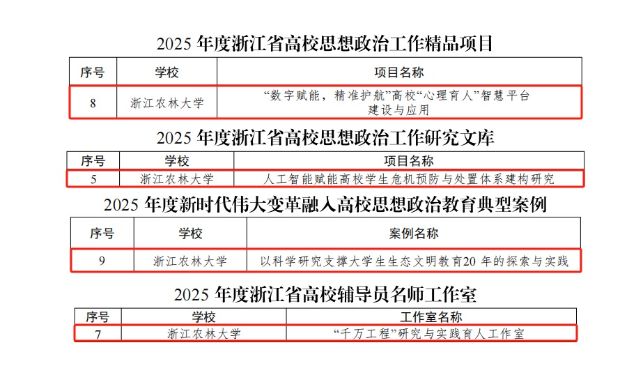 近日,省教育廳公布2025年度省高校思想政治工作質量提升綜合改革與精品建設項目立項結果。我校《“數字賦能,精準護航”高校“心理育人”智慧平臺建設與應用》《人工智能賦能高校學生危機預防與處置體系建構研究》《以科學研究支撐大學生生態文明教育20年的探索與實踐》《“千萬工程”研究與實踐育人工作室》四個項目成功入選。