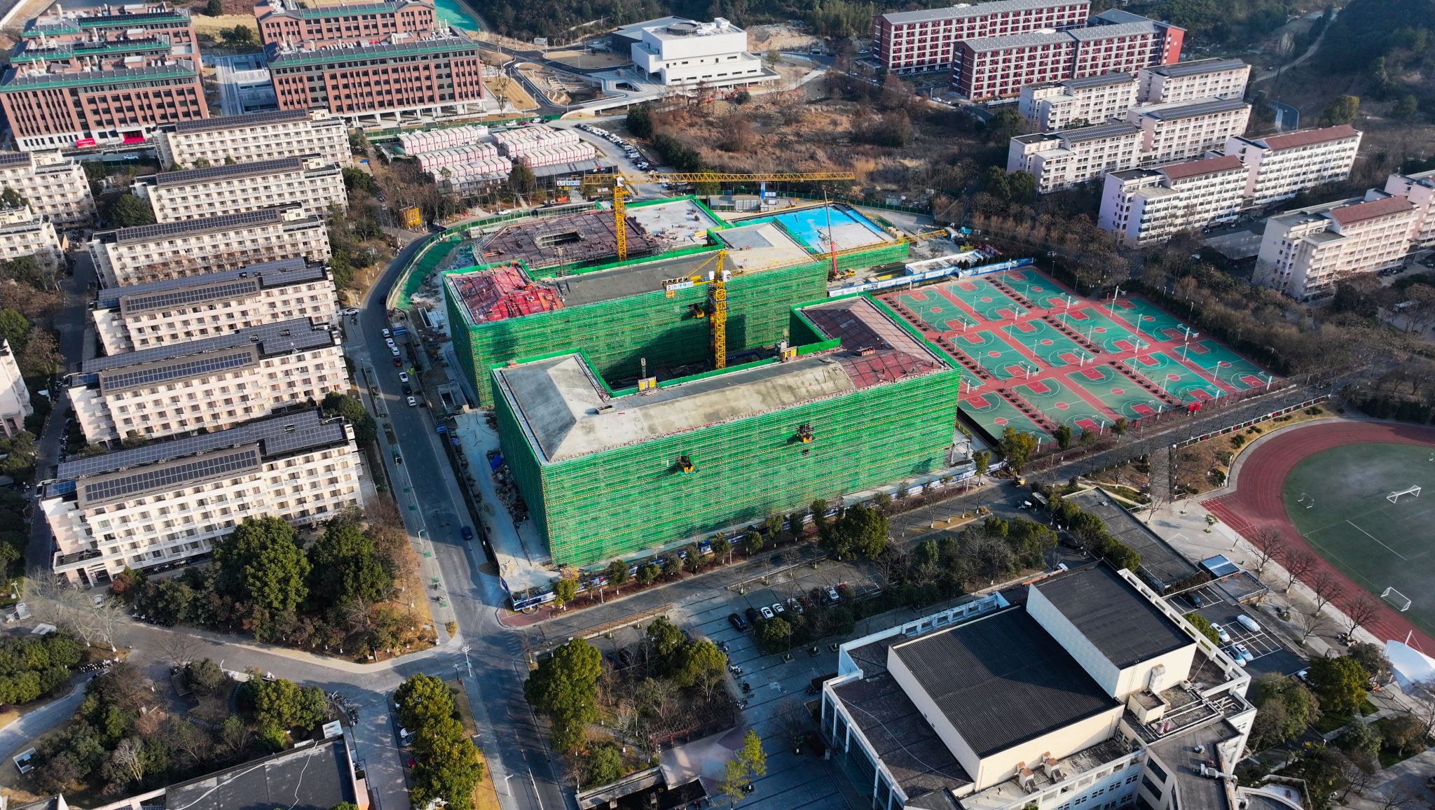 歲末深冬,陽光明媚。1月18日,浙江農林大學東湖校區D區學生宿舍建設工程施工現場熱鬧非凡,伴隨著最后一方混凝土的澆筑到位,D區學生宿舍建設工程兩幢宿舍樓主體結構順利結頂。
