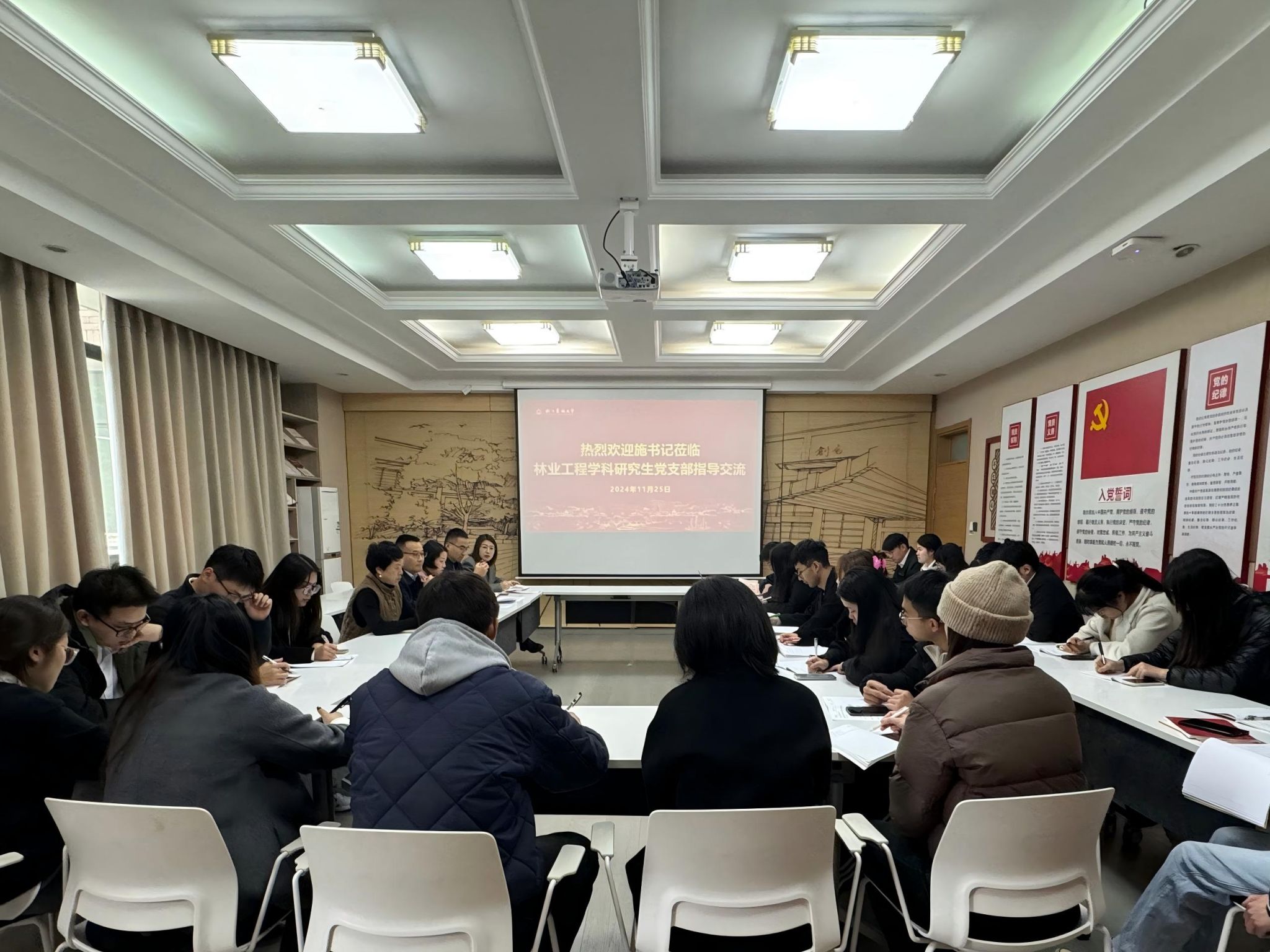11月25日,校黨委副書(shū)記施美紅走訪調(diào)研林業(yè)工程學(xué)科研究生黨支部,并宣講黨的二十屆三中全會(huì)精神。化材學(xué)院負(fù)責(zé)人以及黨支部全體黨員等30余名師生參與了此次主題黨日活動(dòng)。