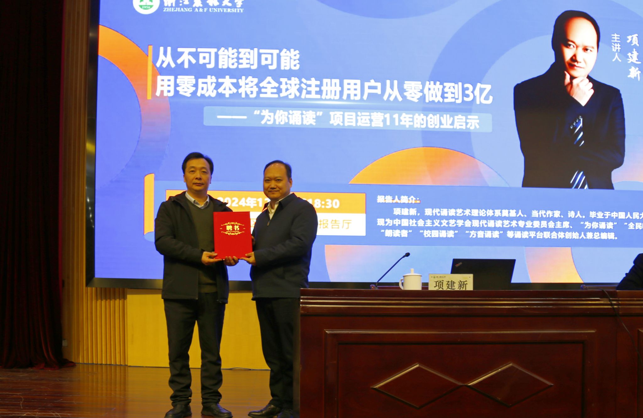 報告會開始前,舉行了聘任儀式。倪建均為項建新頒發了學校大學生創業導師聘書。