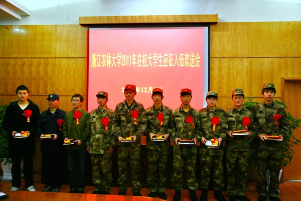 浙農林大新聞網訊 12月8日上午,學校在行政樓第一會議室舉行2011年在校大學生入伍歡送會,校黨委委員、紀委書記汪志銀出席并講話。校宣傳部,學工部,人武部及相關學院黨委(總支)負責人、輔導員及入伍同學參加了歡送會。會議由校人武部長馬小輝主持。