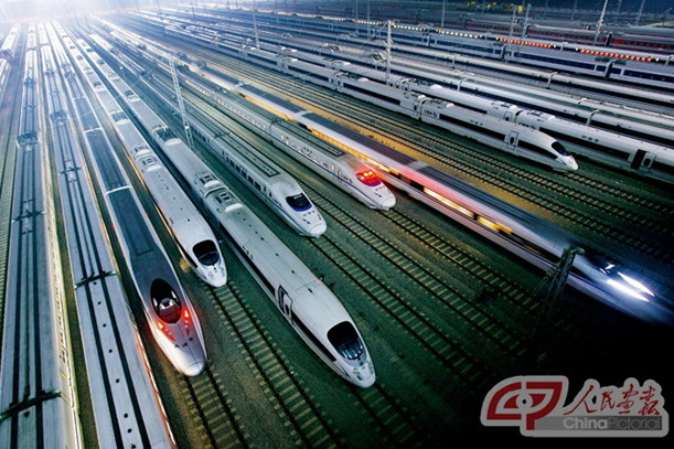 武漢,和諧號CRH列車專用維護機務段。中國鐵路事業迎來了史無前例的發展機遇,成為中國歷史上政府對鐵路投資最多、建成規模最大、建設水平最高、創新成果最明顯的時期。其中,高速鐵路從無到有,總里程躍居世界第一,成為展示中國改革發展新成果的“國家名片”。