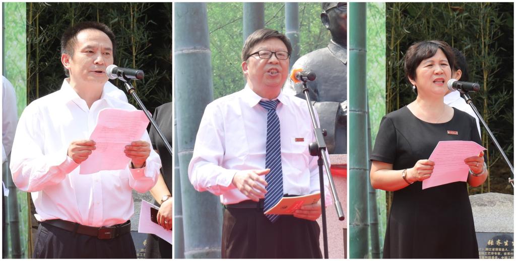 周國模、應義斌、陳敬佑、張院士之子張宏、捐贈企業代表顧水祥共同為張齊生院士雕像揭幕。張院士家屬代表和學生代表先后向張院士雕像敬獻花籃,全體在場人員向雕像行禮致敬。