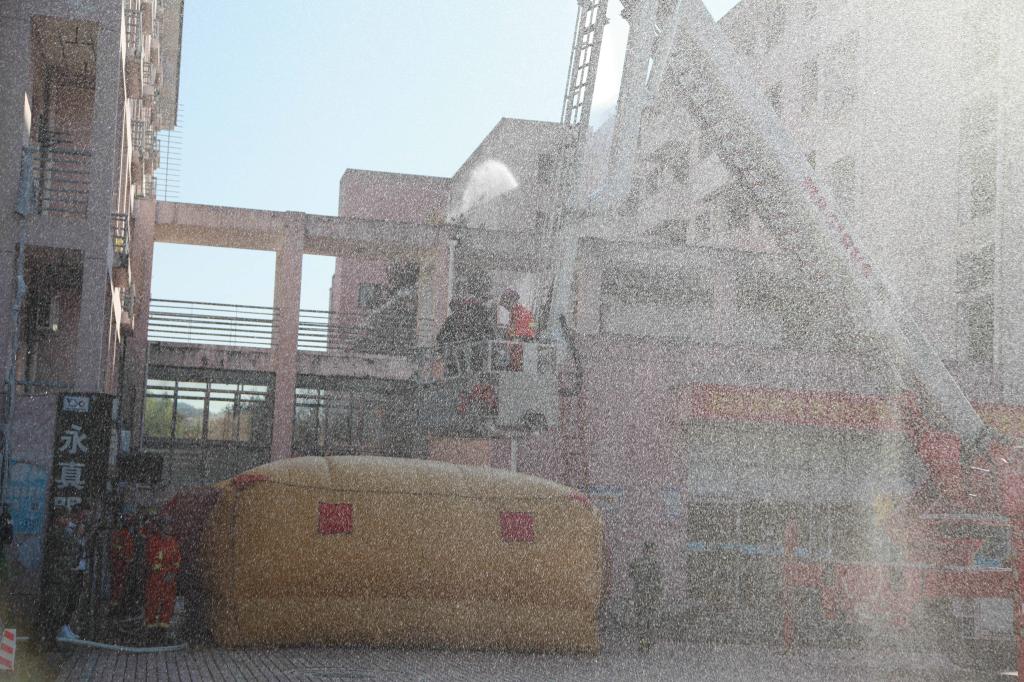 消防滅火救援演練開始。A3、A4學(xué)生公寓濃煙四起,學(xué)生發(fā)現(xiàn)火情后,緊急呼救,公寓管理員立即撥打“校園110”報(bào)警并發(fā)出火警信號(hào),指揮中心接警后,迅速啟動(dòng)浙江農(nóng)林大學(xué)突發(fā)事件應(yīng)急處置預(yù)案,指揮應(yīng)急隊(duì)員及校衛(wèi)隊(duì)員趕赴“火災(zāi)現(xiàn)場(chǎng)”開展滅火、警戒和人員疏散。樓宇疏散引導(dǎo)員指揮被困學(xué)生用濕毛巾捂住口、鼻,單列、靠右沿樓道有序撤離。第一梯隊(duì)學(xué)生公寓志愿消防員火速達(dá)到現(xiàn)場(chǎng)施救,隨后,第二梯隊(duì)微型消防站消防隊(duì)員、志愿消防隊(duì)員緊急到達(dá)火災(zāi)現(xiàn)場(chǎng)救援。臨安區(qū)消防大隊(duì)接警后,出動(dòng)應(yīng)急救援車、消防車等多輛消防車和30余名消防官兵,及時(shí)趕到現(xiàn)場(chǎng)救援,消防官兵充分運(yùn)用高空云梯、竹梯、氣墊、高空緩降等方式,施救被困人員,待人員有序撤離后,迅速撲滅火患。