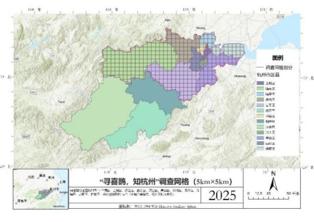 “我們計劃在杭州市下轄10個區,劃分5千米×5千米的網格402個,每個網格內設置1-2條長度為1千米的樣線展開調查,并建立杭州市喜鵲分布動態數據庫,分析城市綠地結構與喜鵲棲息地關聯性。” 浙江農林大學自然教育研究中心吳曉華老師介紹道,同時,借助探尋喜鵲的過程,引領志愿者們領略喜鵲在宋代詩詞中的意境、繪畫上的神韻以及民俗里的韻味,去感受和觸摸宋韻文化的獨特魅力。