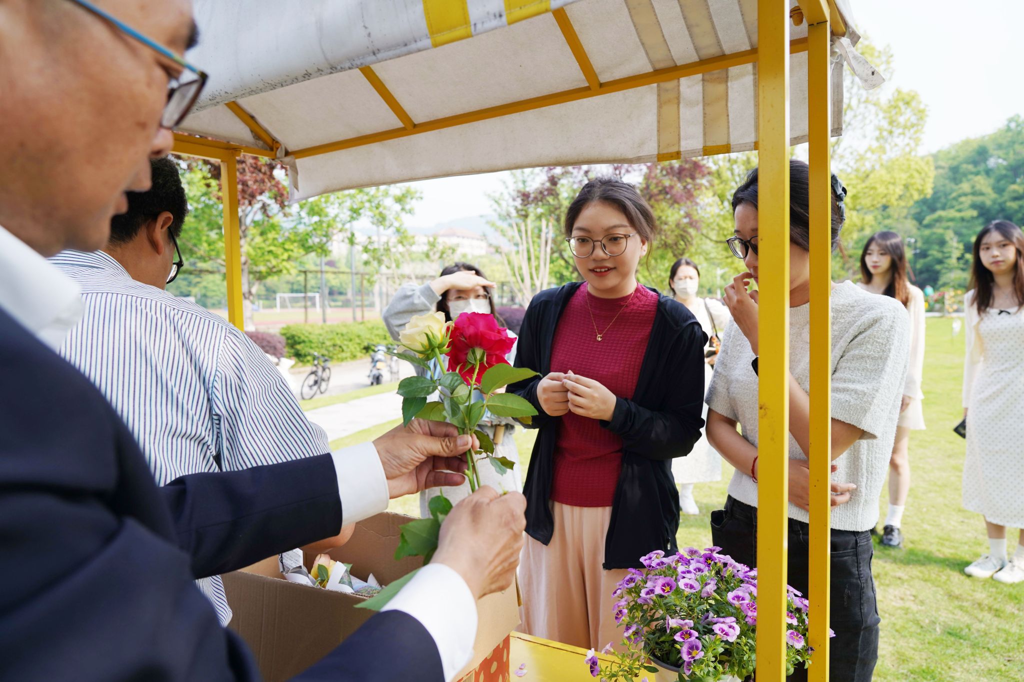 現(xiàn)場,數(shù)百名在校師生、周邊市民陸續(xù)前來領(lǐng)取月季花,并在風(fēng)鈴書簽上寫下美好的祝福,共享這份美麗與浪漫。