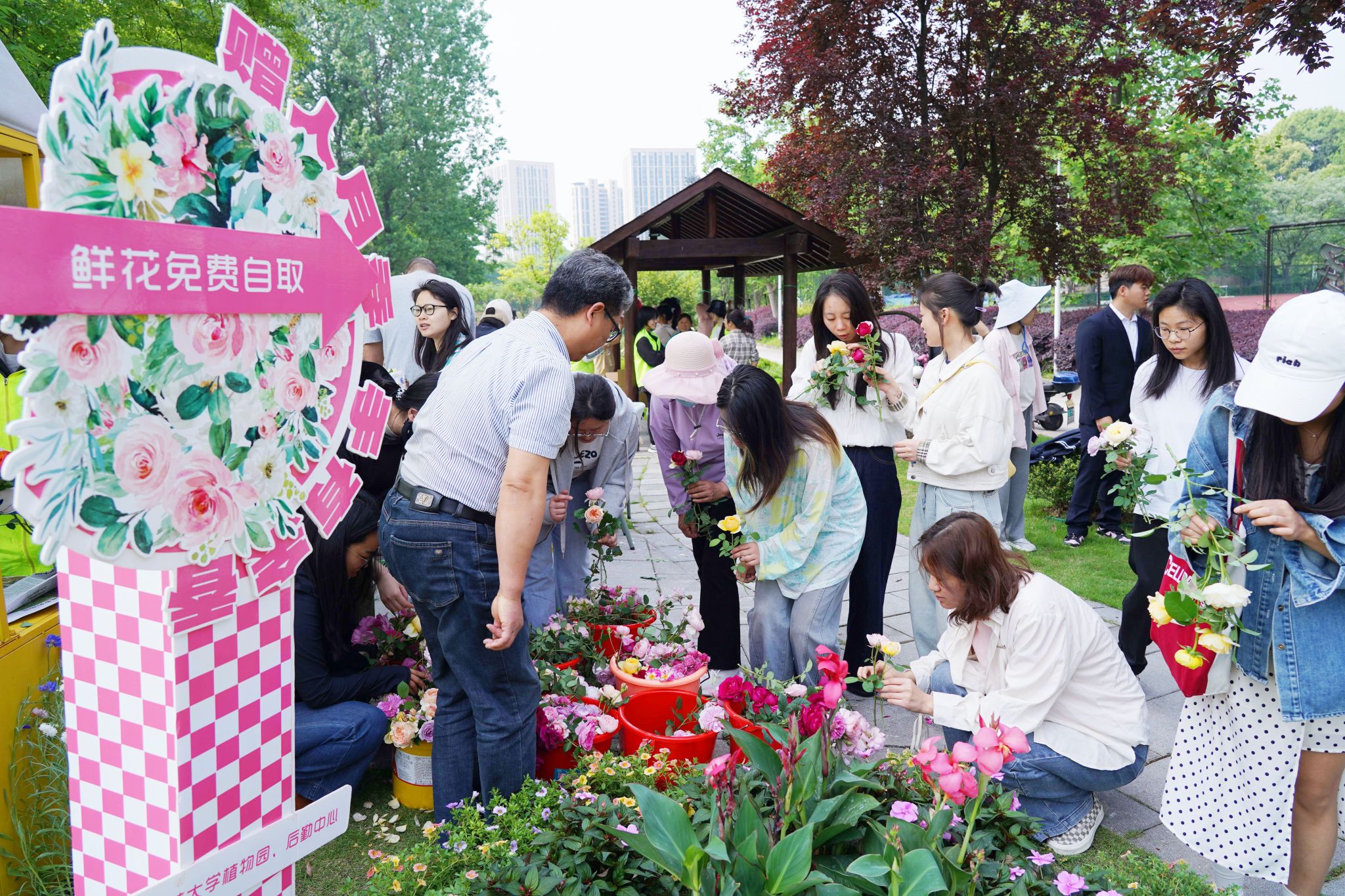 得知師生的需求后,浙江農(nóng)林大學(xué)植物園辦公室、后勤中心等部門決定,開展“贈人月季,手有余香”活動,將所有修剪下來的月季花統(tǒng)一挑選整理,將花型還不錯、有欣賞價值的月季一桶一桶裝好,免費贈送給校園里愛花的師生。