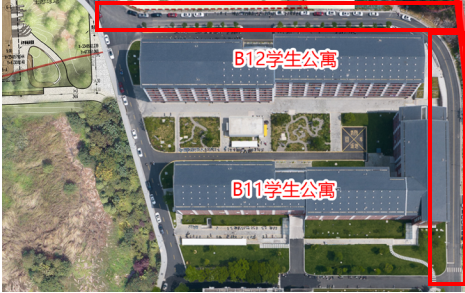 學生宿舍B12西面路口至學生宿舍B11東面路口,具體路段詳見下圖紅框區域。
