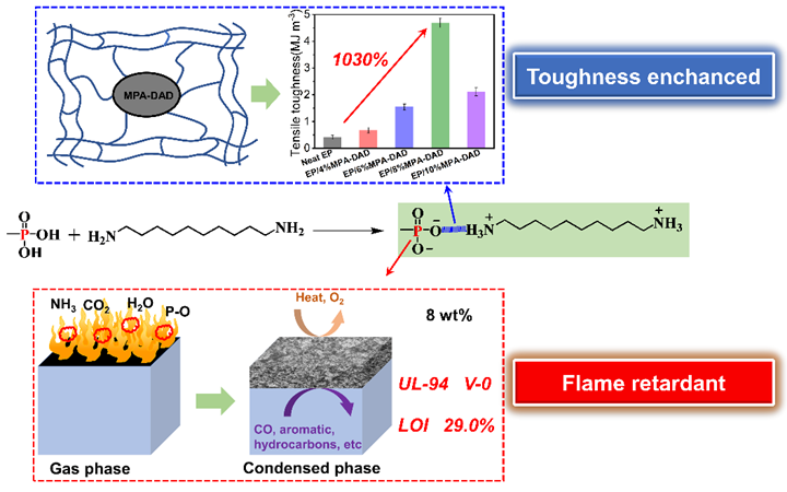 該研究以“Novel Ionic Complex with Flame Retardancy and Ultrastrong Toughening Effect on Epoxy Resin(固態環氧樹脂基于離子犧牲鍵的阻燃和超級增韌)”為題,針對固態環氧樹脂易燃和質脆的問題,首次提出了基于離子犧牲鍵的環氧樹脂增韌方法。通過甲基膦酸(MPA)和有機胺之間簡單的一步中和方式,合成了一種阻燃增韌一體的離子絡合物。甲基膦酸有很強的脫水成炭能力,能在凝聚相和氣相中發揮協效作用,賦予固態環氧樹脂具有阻燃能力。甲基膦酸與有機胺通過離子鍵鍵合,在受到應力作用時,離子鍵可作為犧牲鍵發生斷裂而耗散能量,從而提高材料的韌性。所發明的這種新型增韌技術方法,當添加量為8%時,EP/8% MPA-DAD的極限氧指數(LOI)達到了29.0%,通過了UL-94 V-0測試,沖擊強度、拉伸強度和彎曲強度較純EP分別提高了69%、18%和20%,拉伸韌性和彎曲韌性分別提高了1030%和611%,達到超級增韌。