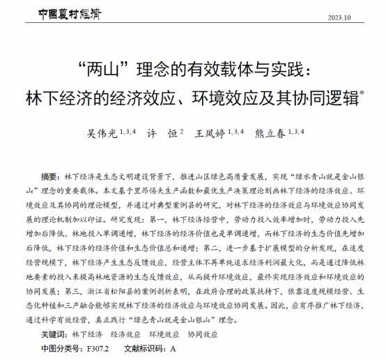 近日,經(jīng)濟管理學院吳偉光教授團隊的研究論文《“兩山”理念的有效載體與實踐:林下經(jīng)濟的經(jīng)濟效應(yīng)、環(huán)境效應(yīng)及其協(xié)同邏輯》在知名期刊《中國農(nóng)村經(jīng)濟》2023年第10期發(fā)表。中國政法大學商學院許恒副教授為第二作者,浙江農(nóng)林大學浙江省鄉(xiāng)村振興研究院研究人員王鳳婷博士為第三作者,浙江農(nóng)林大學生態(tài)文明研究院熊立春副教授為通訊作者。