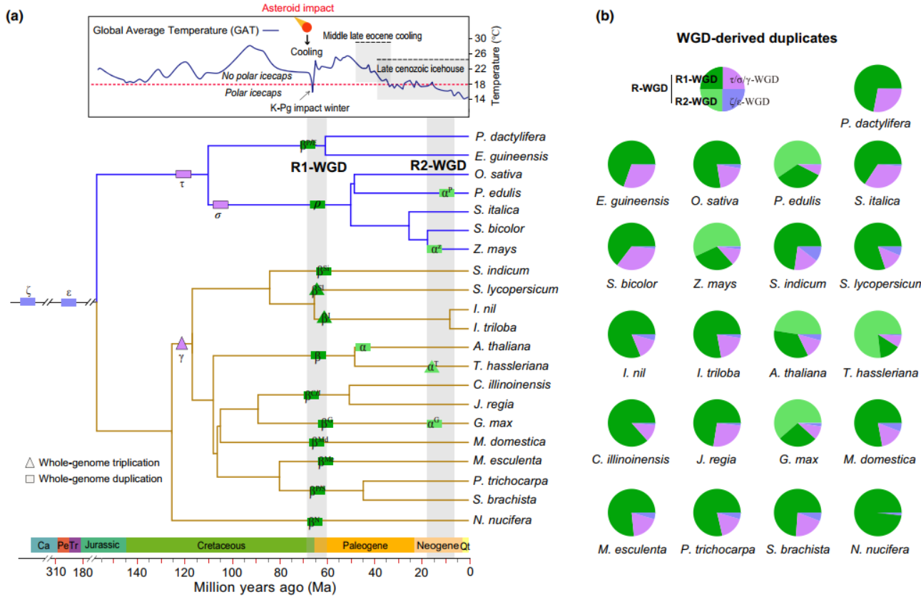 近日,浙江農林大學國家重點實驗室李彥、吳文武教授與比利時根特大學Yves Van de Peer院士聯合在《New Phytologist》(中國科學院1區Top,IF5-yr=10.5)上發表了題為“Convergent and/or parallel evolution of RNA-binding proteins in angiosperms after polyploidization”(被子植物多倍化后RNA結合蛋白的趨同或平行進化)的研究論文。該研究主要基于擬南芥、毛果楊、蘋果、番茄、大豆、山核桃、水稻、玉米、毛竹、棕櫚等21個代表性被子植物,結合基因組學、轉錄組學、調控組學以及古氣候學研究數據,揭示了在WGD后被子植物RBP基因趨同進化以適應K-Pg和晚新生代冰期的全球大降溫。