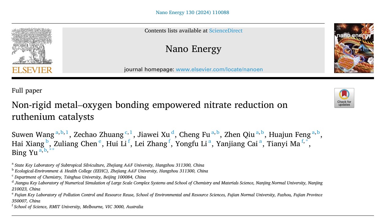 8月7日,環(huán)資院、碳中和學(xué)院余兵教授領(lǐng)銜的環(huán)境功能材料團(tuán)隊(duì)在國(guó)際頂尖期刊《Nano Energy》(中科院1區(qū)Top,IF=16.8)在線發(fā)表題為《非剛性金屬?氧鍵增強(qiáng)釕催化劑的硝酸還原活性和穩(wěn)定性》(Non-rigid metal–oxygen bonding empowered nitrate reduction on ruthenium catalysts)的研究論文。浙江農(nóng)林大學(xué)為該論文第一單位和通訊作者單位。該團(tuán)隊(duì)2021級(jí)碩士研究生汪素聞為第一作者,環(huán)資院、碳中和學(xué)院余兵教授為該論文的通訊作者。