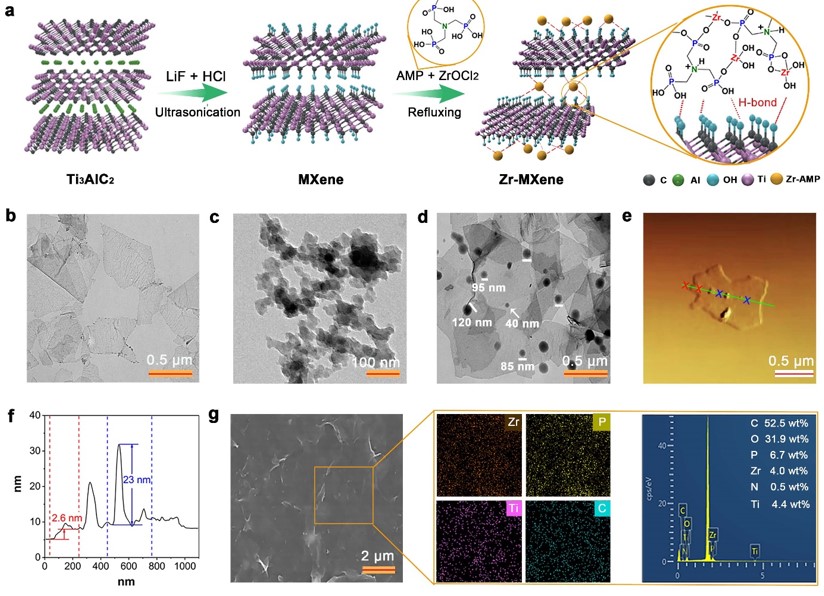 該研究通過原位法制備一種新型功能化MXene納米二維材料,將納米Zr-AMP負載其表面,制得具有阻燃性能的雜化物Zr-MXene。通過溶劑法和熔融共混法將Zr-MXene均勻分散于熱塑性聚氨酯TPU基體中。研究結果表明,與TPU純樣相比,添加1 wt% Zr-MXene的TPU/1Zr-MXene,其延展性提高了33%,韌性提高了88%,達到了TPU迄今為止的最高延展性和韌性。同時,拉伸強度和抗疲勞性能也有一定的提高。這種同時提高強度、延展性和韌性的材料遠優于從前,因為MXene納米片層良好的界面和H-鍵相互作用和機械增強。此外,對TPU的熱釋放和煙釋放顯著降低,是由于MXene的阻隔效應與Zr-AMP的催化碳化和稀釋效應協同作用的結果。本工作中的阻燃設計表明Zr-MXene改性的TPU納米復合材料具有良好的拉伸性能、韌性、抗疲勞和阻燃性能,有望在交通運輸、電氣和織物等領域得到廣泛應用。