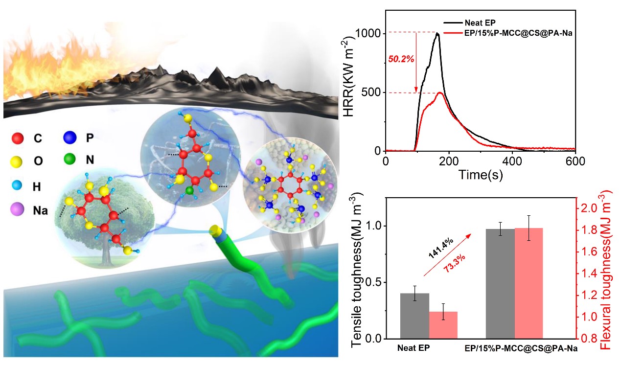 該研究以天然纖維素為原料,引入磷酸基團,殼聚糖以及植酸鈉,通過磷酸化和層層自組裝,合成一種“芯鞘”結構的全生物基阻燃劑。在環氧樹脂中可顯著提高阻燃性能,15wt%添加量時,環氧樹脂的熱釋放速率峰值(pHRR),總熱釋放(THR),煙釋放速率峰值(pSPR)以及總煙釋放(TSP)分別下降了50.2%,25.7%,38.5%和38.6%;極限氧指數從20.4%提升至26.2%。此外,該纖維素基阻燃基與環氧樹脂具有良好的相容,在同樣的添加量下,其拉伸強度,彎曲強度和沖擊強度分別提高了30.7%,34.2%和40.3%。該項研究工作為多功能生物基阻燃劑的綠色制備提供了一種創新思路。