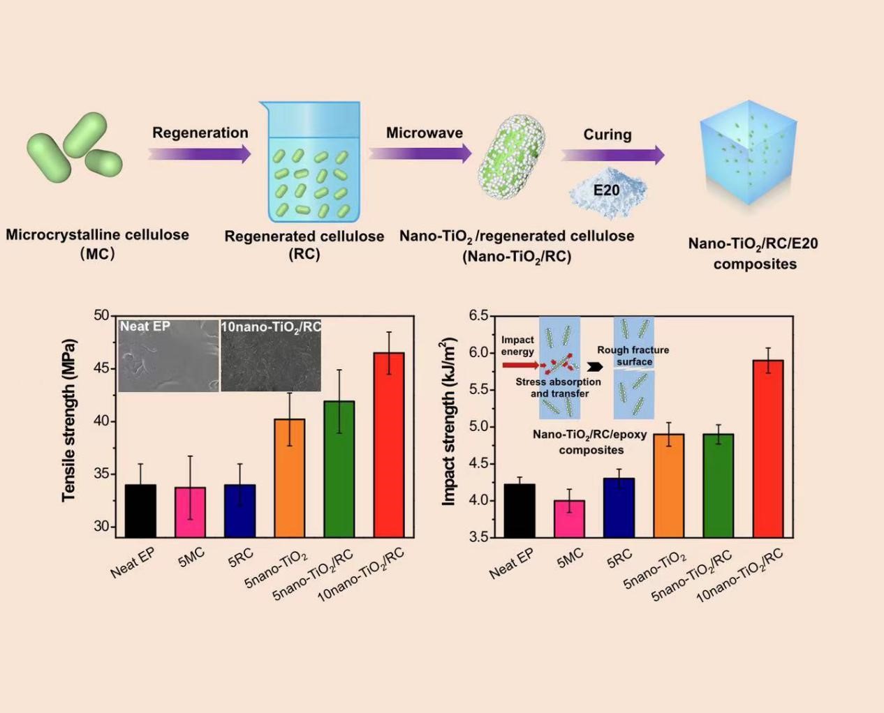 “A nano-TiO2/regenerated cellulose biohybrid enables simultaneously improved strength and toughness of solid epoxy resins”于2021年5月29日發表于復合材料領域國際期刊《Composites Science and Technology》(IF=8.525)上。第一作者為本校博士研究生楊佳瑤,指導老師為浙江農林大學傅深淵教授、劉曉歡博士和南昆士蘭大學宋平安教授。