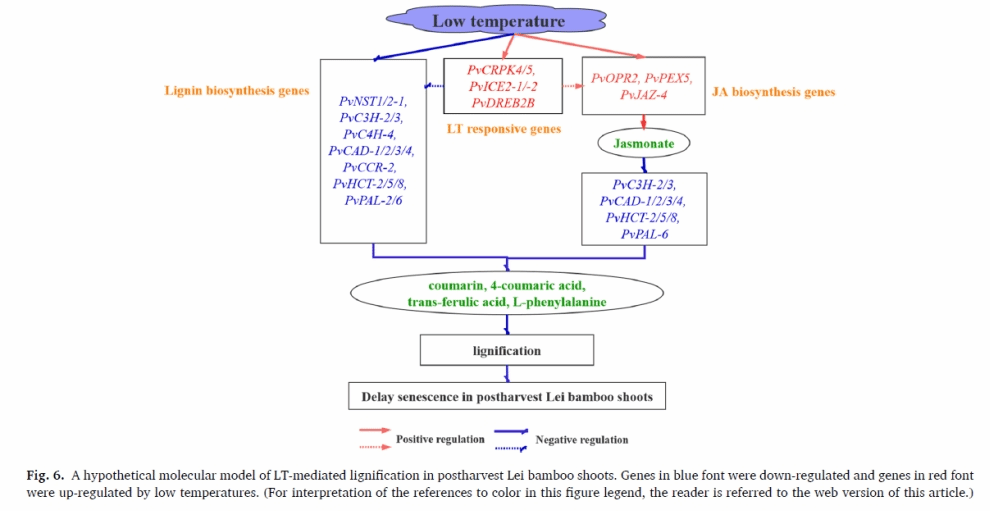 近日,國際知名學(xué)術(shù)期刊Food Chemistry(IF=7.514)在線發(fā)表了國家重點(diǎn)實(shí)驗(yàn)室竹子研究團(tuán)隊(duì)題為“Integrative transcriptomic and metabolomic data provide insightsinto gene networks associated with lignification in postharvest Lei bamboo shoots under low temperature”的研究論文。該研究提出低溫可能通過直接抑制,或通過誘導(dǎo)茉莉酸合成來間接抑制木質(zhì)素合成基因表達(dá),進(jìn)而降低采后雷竹筍木質(zhì)化來延緩其衰老。