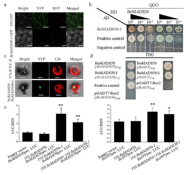 該研究發(fā)現(xiàn)竹子SOC1-like基因BoMADS50在葉片和花芽分化時(shí)期高表達(dá),且水稻和擬南芥中異源超表達(dá)后可導(dǎo)致轉(zhuǎn)基因植物開(kāi)花顯著提前。同時(shí),BoMADS50可與開(kāi)花關(guān)鍵因子AP1-like蛋白發(fā)生互作,并且BoMADS14-1可結(jié)合BoMADS50啟動(dòng)子并上調(diào)其表達(dá)。此外,該研究還發(fā)現(xiàn)BoMADS50具有不同的SNP(BoMADS50-1/2/3/4),異源轉(zhuǎn)化結(jié)果顯示這些SNP在促進(jìn)開(kāi)花方面具有很強(qiáng)的保守性,但與BoMADS50不同的是,只有BoMADS50-1可上調(diào)下游BoSVP和自身表達(dá)。BoMADS50不同SNP功能的保守性可能造成了竹子的成片大量開(kāi)花,而當(dāng)BoMADS50-1起主導(dǎo)作用時(shí),可能導(dǎo)致部分竹子零星開(kāi)花。上述研究結(jié)果為進(jìn)一步揭示竹子開(kāi)花機(jī)理提供了一定的依據(jù)。