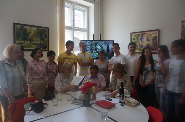 簽約儀式在合作雙方30余師生見(jiàn)證下順利完成。簽約后,合作雙方對(duì)該教學(xué)點(diǎn)自今年2月以來(lái)所開(kāi)展的漢語(yǔ)教學(xué)及文化活動(dòng)表示了肯定,對(duì)未來(lái)的合作規(guī)劃進(jìn)行了具體的探討,并達(dá)成了一致的意見(jiàn)。Ivana教授在會(huì)談中表示,中國(guó)現(xiàn)在是一個(gè)引領(lǐng)世界發(fā)展的大國(guó),中國(guó)文化博大精深,將給越來(lái)越多的世界人民帶來(lái)好處;塞爾維亞青年學(xué)生需要更多地了解和學(xué)習(xí)優(yōu)秀文化,孔子學(xué)院愿意為當(dāng)?shù)貙W(xué)生提供學(xué)習(xí)漢語(yǔ)和了解中國(guó)文化的平臺(tái)。